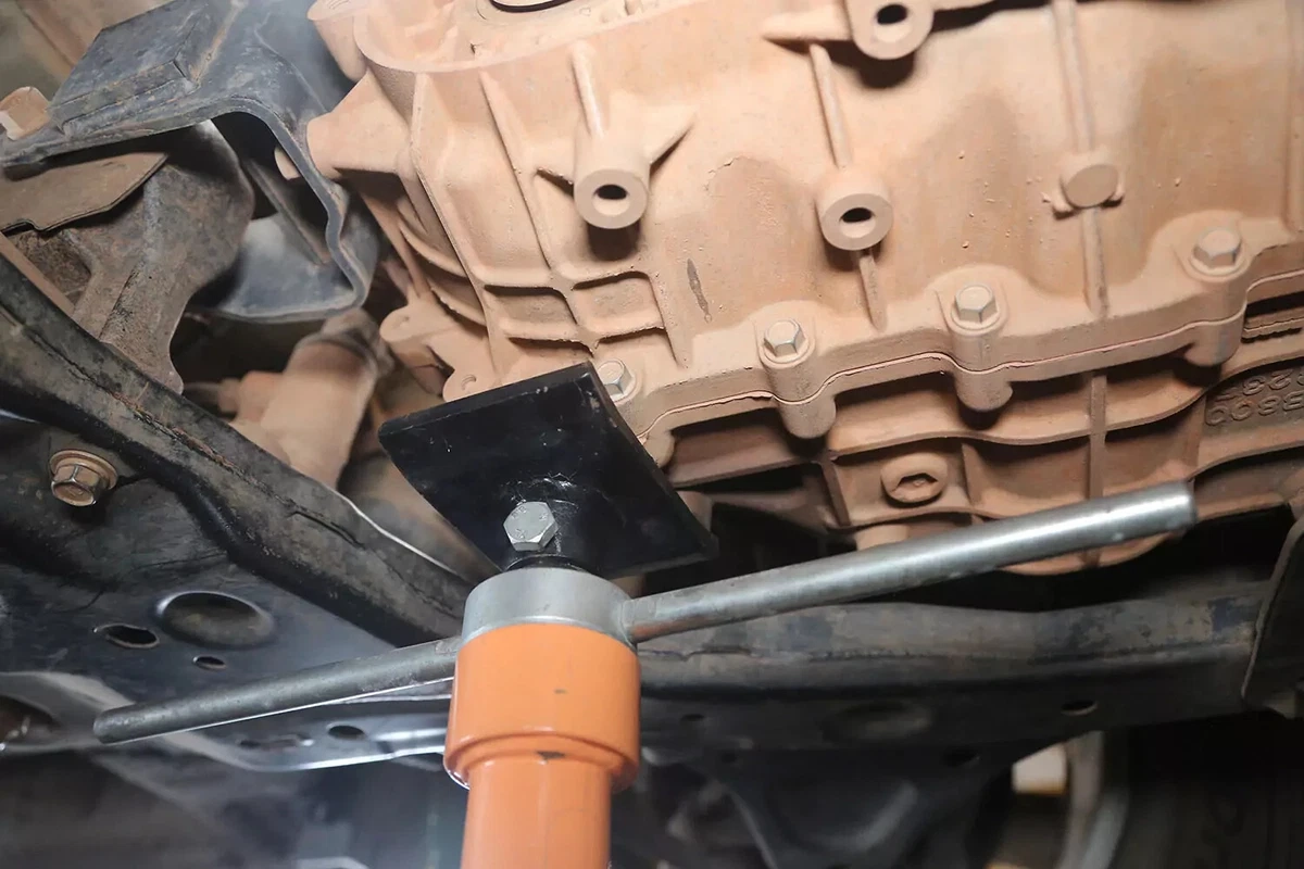 На нашем демонстрационном автомобиле имеются опорные выемки, которые фиксируют крепление в кронштейне крепления коробки передач. Нам пришлось применить дополнительный подъемник, чтобы освободить крепление.