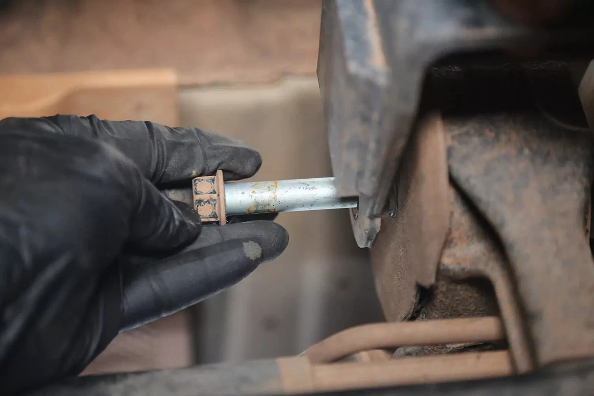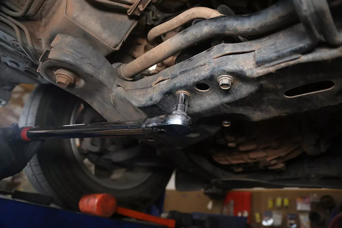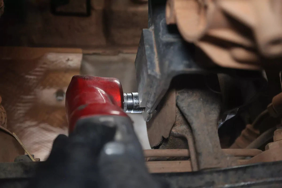 Наш демонстрационный автомобиль оснащен поперечным болтом, который снимается с помощью гаечного ключа с одной стороны и торцевой головки с другой. Их может быть трудно удалить в ограниченном пространстве. Используйте прерыватель, ударный гайковерт или мошенническую планку, чтобы получить необходимый рычаг.